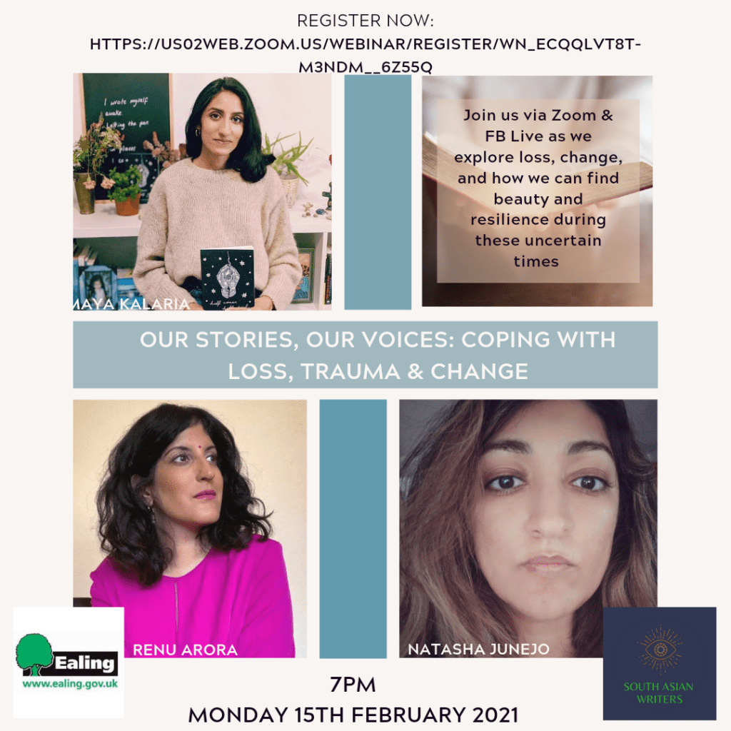 Join Natasha Junejo, founder of South Asian Writers, in partnership with Ealing Libraries as we talk to poet, Maya Kalaria and singer, writer, and performer, Renu Arora. We shall be exploring Maya and Renu’s powerful work around grief, loss, and change; how this has shaped their approach to life, and where we can find beauty and resilience when things overwhelm us.